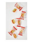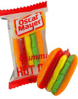 Bag contains40 individually wrapped fruit flavored gummy hot dogs.