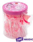 Jar contains 20 individually wrapped Pink Strawberry CurlyCutes Pops Petite Ribbon Lollipops.