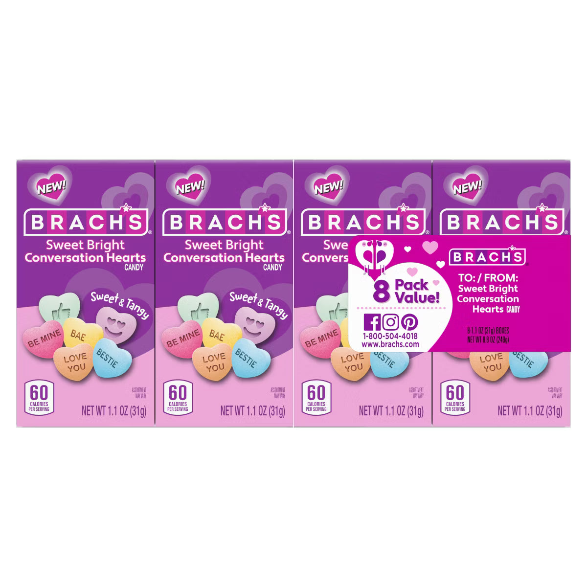 Brach’s conversation hearts are the delicately sweet little candies that say those words you feel without the uncomfortable awkwardness! Phrases like “Be Mine,” and “You & Me,” as well as modern sayings like “Text Me” are at your fingertips to convey your most heartfelt sentiments, all in delicious flavors including lemon, banana, cherry, grape, orange, and wintergreen. For those moments when a minuscule message just won’t do, Brach’s large conversation hearts deliver those sweet nothings as big and bold as possible! And just so language is never a barrier to true love, this classic Valentines day candy comes in a Spanish version as well! Have a heartfelt candy conversation without ever uttering a word with the vast selection of Brachs conversation hearts flavors at Candy Warehouse!