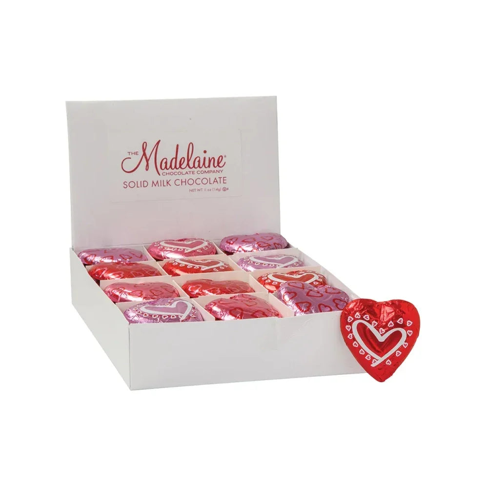 Unwrap the smooth, decadent experience that is Madelaine foiled heart chocolates! Coming in an array of delightfully creamy flavors, these individually wrapped treats make fantastic party favors, holiday desserts, and after-dinner snacks. Choose from a range of foil colors, including gold, red, white, and blue, green, purple, and elegant and popular Madelaine silver foiled hearts. Beyond mouthwatering milk and dark chocolate options, explore other varieties like peanut butter filled, caramel filled, and high cocoa content. Perfect for Valentineβs Day, our selection of pink, red, and purple foiled Madelaine heart chocolate pieces come in bulk 5 lb boxes, ready for you to share the love! Enjoy the rich flavors of these classic chocolates when you purchase bulk boxes at Candy Warehouse.