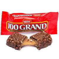 Invest in this 72-piece case of 100 Grand fun size candy bars for delicious leverage at home, school, work, and play. The currency theme of this classic American confection makes it ideal for corporate sales incentives, employee rewards programs, trade show giveaways, and casino night fundraisers. An individually wrapped snack-size 100 Grand chocolate bar can be a powerful motivator in the classroom, and the cheerful red packaging makes it a natural addition to Valentine’s Day candy buffets, Christmas stockings, and 100-year-old birthday parties. Mini 100 Grand bars provide the perfect pairing of chewy caramel and rich milk chocolate crunch for a flavor and texture combo your taste buds will celebrate. You can bank on Candy Warehouse to get your 100 Grand mini chocolate bars to you fast and fresh.