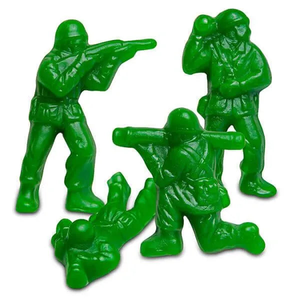 Bombs away!!! Play with and then eat these sweet green apple gummy soldiers... "Bazooka" Bob, "Forrest Fight" Steve, "GI" Johnny, "Sniper" Scott, and "Rifleman" Rich! Ready to battle the boring doldrums of the plain old gummy bear, Gummi Army Men feature an assortment of green soldier designs with bazookas, rifles, and various other high-powered weapons.