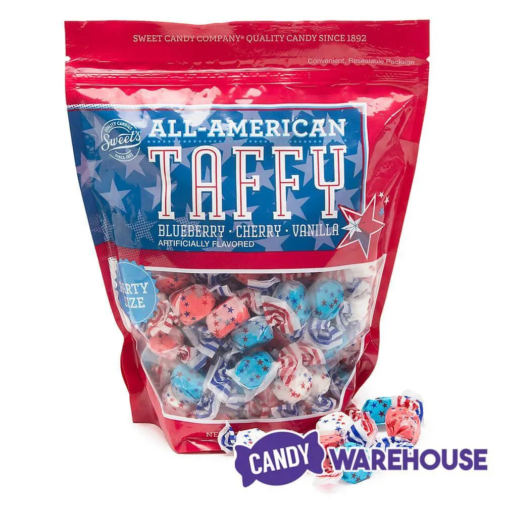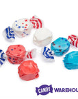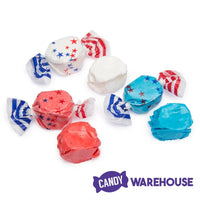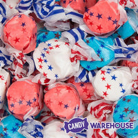 Delicious salt water taffy in an assortment of red, white, and blue colors and wrapped in wax paper featuring festive patriotic stars!