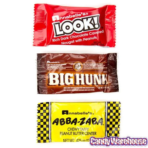 Annabelle’s Trinity, more commonly known as Abba-Zaba, Big Hunk, and Look!, are all present. In 80 snack-sized pieces, you have the choice to unwrap the yellow race car wrapper for a chewy time of peanut butter-centered white taffy. Remove Big Hunk’s form-fitting cover for a blend of honey nougat with diced peanuts. Or tear open the inviting red Look! for a bite of dark chocolate, nougat, and peanut perfection. Whichever you choose, your palate will be blessed with divine flavor.