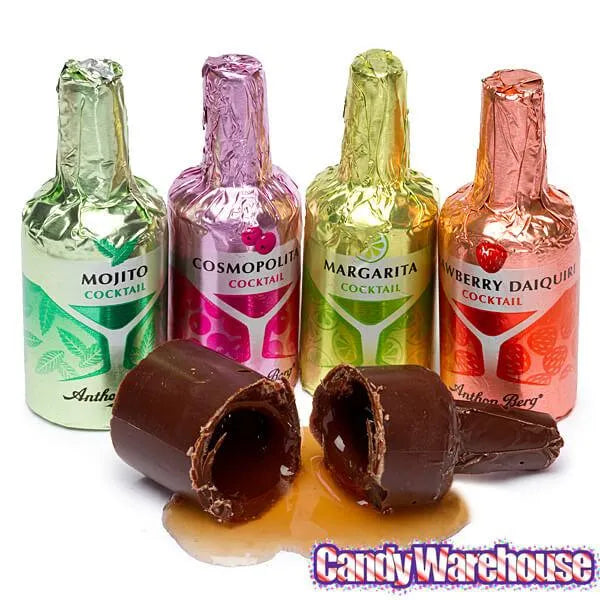 Decadent dark chocolate is formed into hollow bottle shapes and filled with genuine brand name spirits in liquid centers. Each bottle is wrapped with elegant metallic foil representing the liquor brand inside the chocolate. A patented process is used to prevent the liqueurs from leaking; lesser chocolates are lined with sugar to prevent leaking, which can ruin the taste of the liqueurs. Assortment includes four alcoholic beverage favorites: