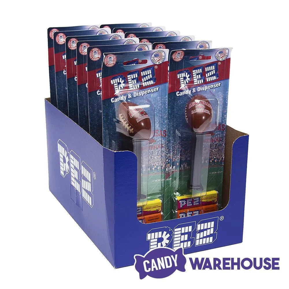Display box contains 12 blister packs of PEZ NCAA University of Arkansas Football Candy Dispensers and Refill Cartridges.