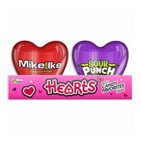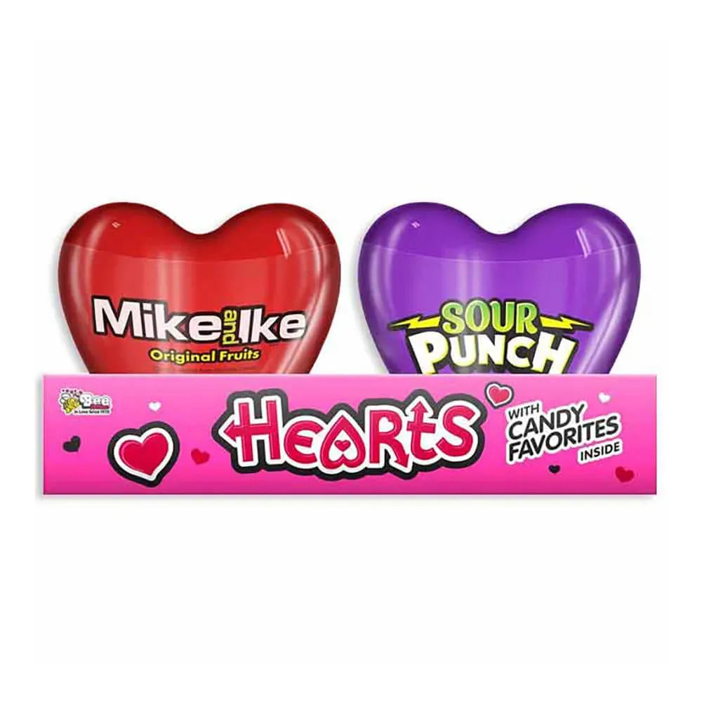 Display box contains 12 Valentine Plastic Hearts, each filled with Mike and Ike and Sour Punch Twist Candies.