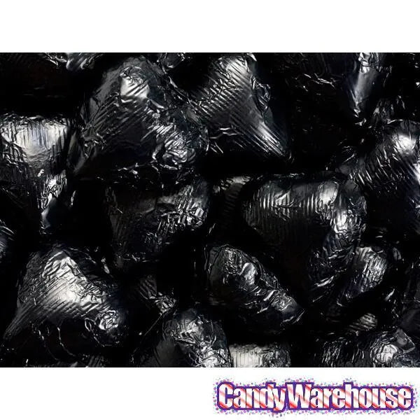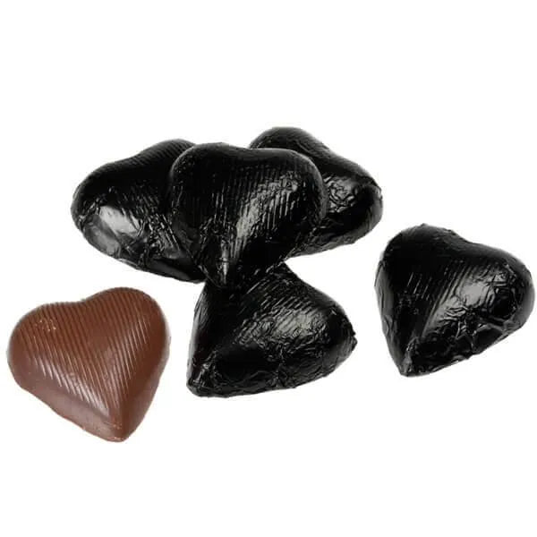 Bag contains 2 pounds of Black Foiled Milk Chocolate Hearts Candy.