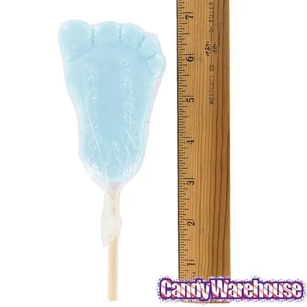 Box contains 12 individually wrapped Blue Jumbo Baby Feet Lollipops.