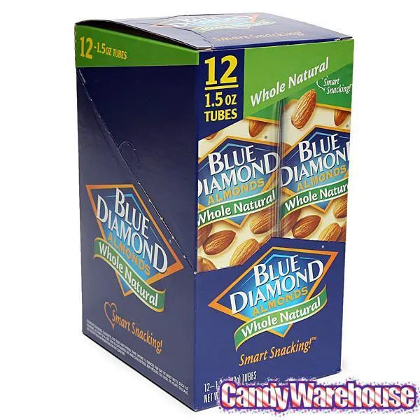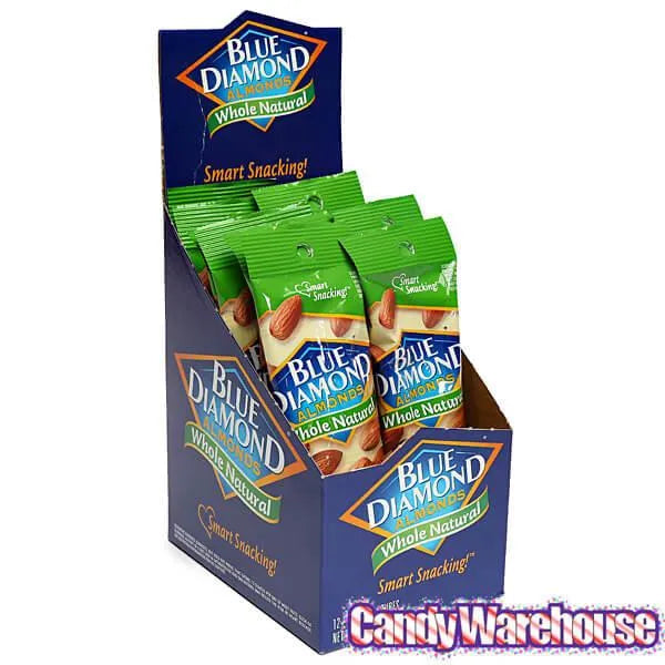 Display box contains 12 Blue Diamond Whole Natural Almonds Nut Bags, each with a net weight of 1.5 ounces.