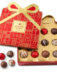 Celebrate with our brand new collection! Adorned with a luxurious gold bow embossed on the lid. Inside, discover a delightful assortment of 12 handcrafted Belgian chocolate truffles, each crafted to perfection. Savor the rich flavors, from the indulgent Milk Chocolate Caramel to the creamy White Chocolate Tiramisu. This exquisite collection makes the perfect festive gift, sure to bring warmth and sweetness to any holiday gathering. Treat yourself or someone special to a taste the magic!