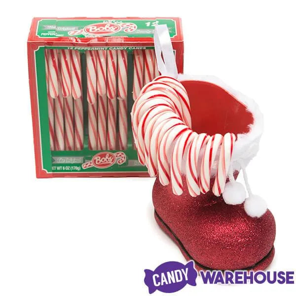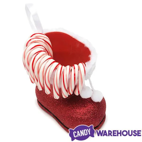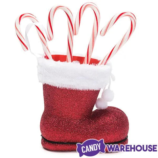 Step-up the presentation of classic candy canes and impress all your holiday visitors with this impressive bright red Santa Claus boot. Adorned in glitter and featuring felt trim with adorable shoe laces with puff balls on the end, this candy cane display makes an excellent addition to the fireplace mantle at home or the lobby desk at the office. Or fill it with cookies for Santa on Christmas Eve.