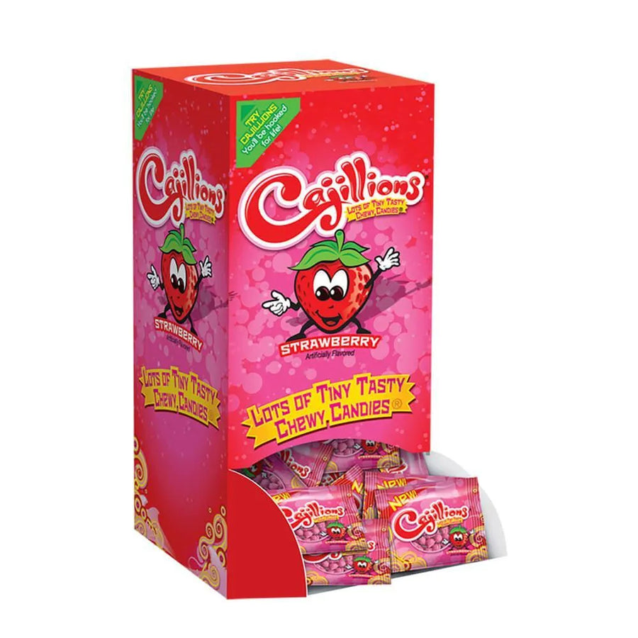 FOREIGN CANDY COMPANY Cajillions are so much fun! These tiny fruity candies have a hard exterior but a delicious chewy center. Lots of tiny tasty chewy candies!Display box contains 120 Cajillions Strawberry Chewy Candy Packs, each weighing .28 ounces.