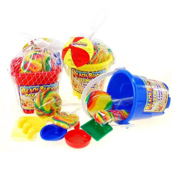 Beach candy! Colorful plastic buckets are filled with 4 miniature swirl lollipops, 4 little sand toys, and a packet of candy sand. A mesh wrap encloses each bucket of treats. Whether you’re going to the beach, the lake, or just to the sandbox, Beach Bucket Toys N' Treats has something for everyone! They make the perfect hostess gift for beach themed events and parties.
