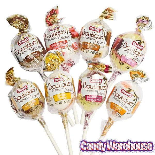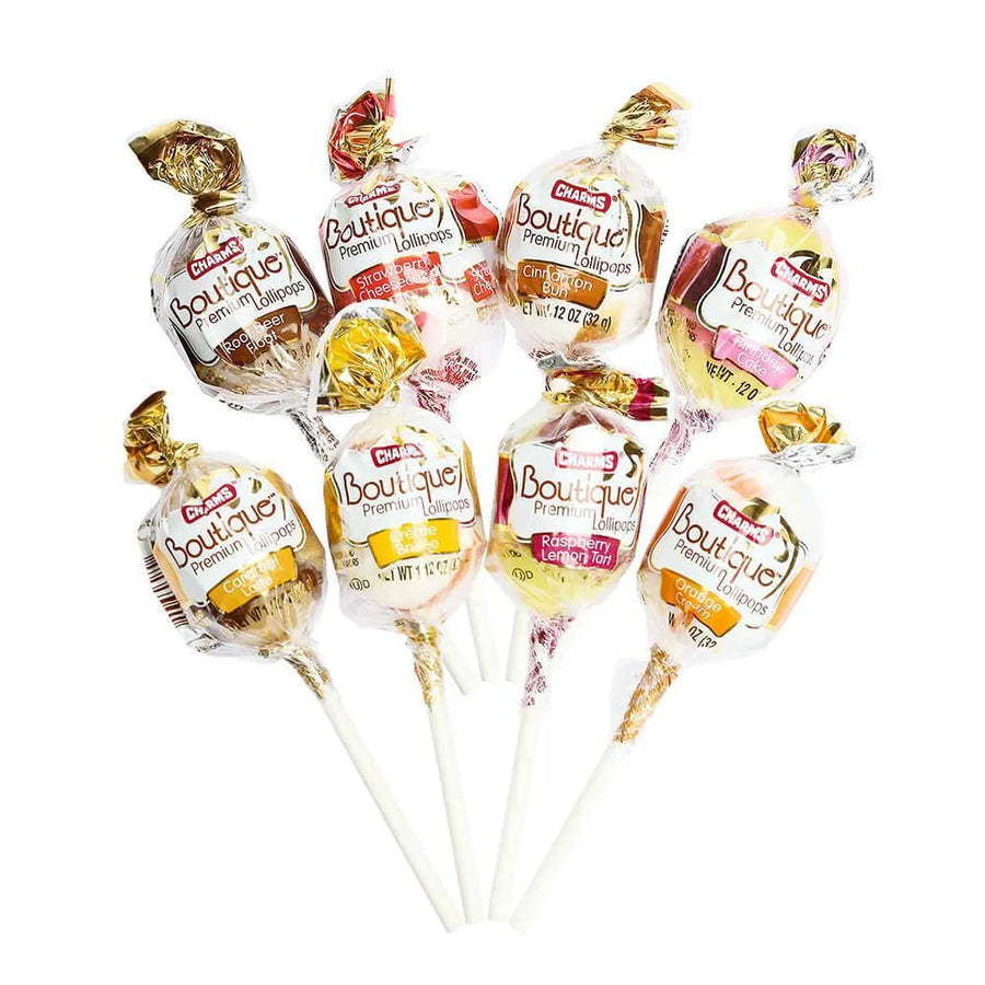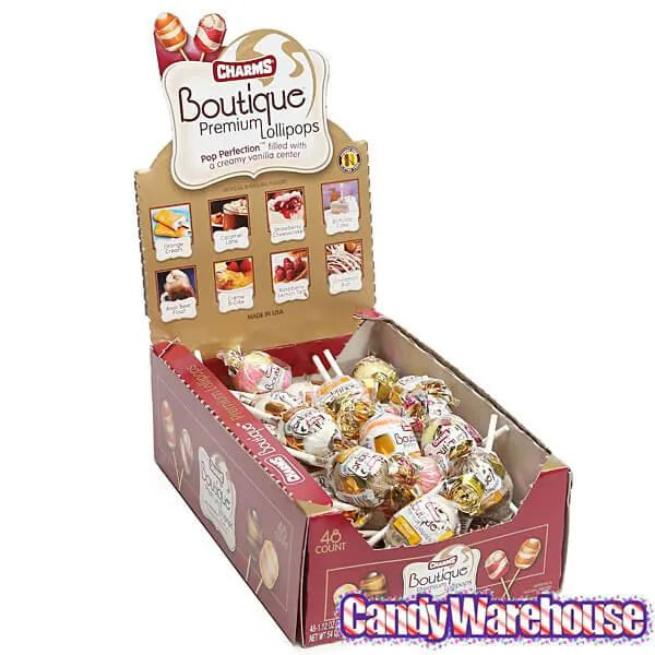 There have been a few desserts in your life that you've never quite forgotten: that orange cream popsicle you had on a hot summer day; the caramel latte you sampled while traveling Europe; the double-frosted birthday cake served at someone else’s party; plus the raspberry lemon tart, strawberry cheesecake, creme brulee, and cinnamon bun you stumbled upon somewhere along the way. Now you can relive all of them with this 48-piece box of Charms Boutique Premium Lollipops. Each savory pop is filled with a creamy vanilla center that will melt with you, even as you form some new favorite memories.