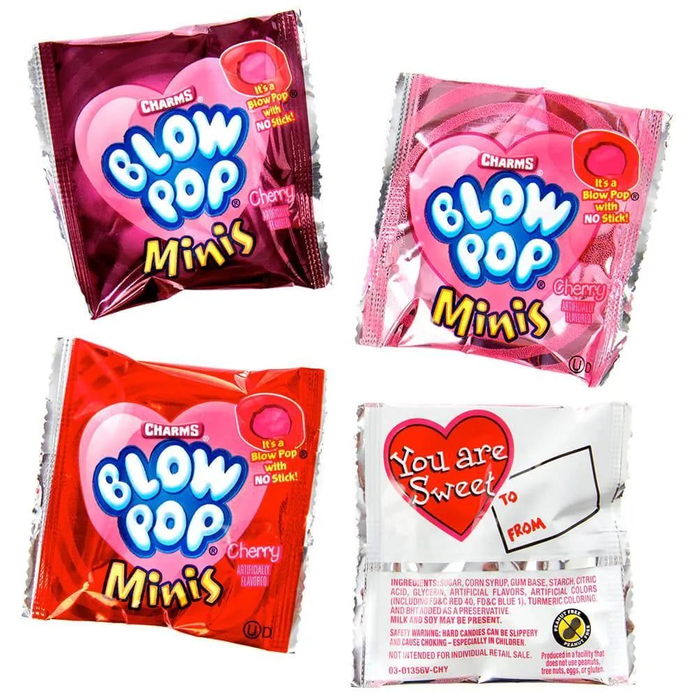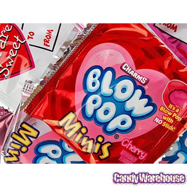 Bag contains 30 snack size packs of Charms Valentine Blow Pop Minis.