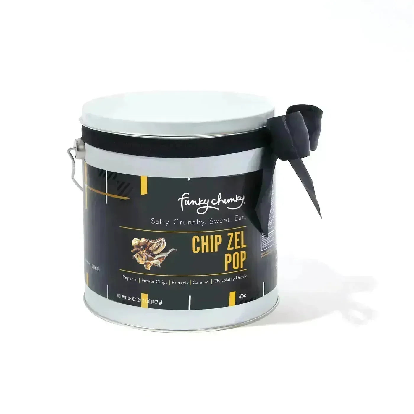 All your cravings satisfied in one bite! Sweet and salty, chewy, crispy and crunchy, Chip Zel Pop gourmet popcorn is an incredible marriage of flavors that will keep you wanting more. Made with crisp potato chips, pretzel sticks, and buttery caramel popcorn - mixed together and drizzled with thick caramel and dark, milk and white chocolatey goodness.