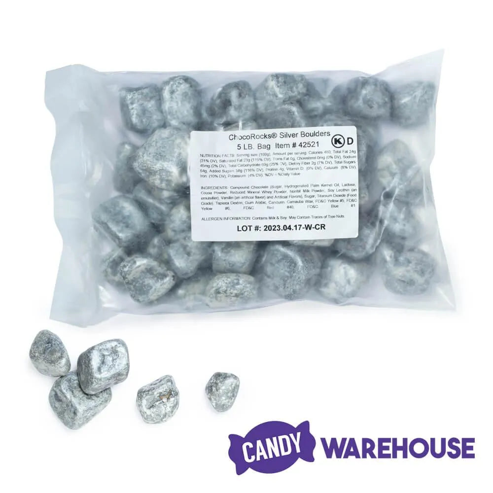 Each bag contains 5 pounds of Choco Rocks Silver Boulders Candy, approximately 30–40 pieces ranging from 1 to 3 inches long.