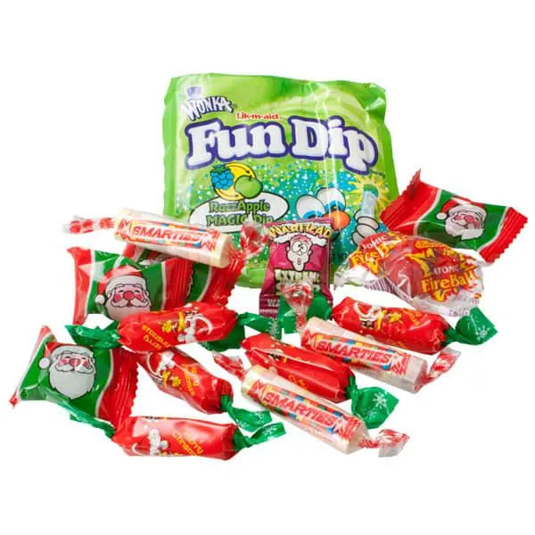 Jolly Saint Nick has stuffed each cute mesh Christmas stocking with a delightful assortment of sweet treats, including Warhead Sour Packs, Smarties Rolls, and Wonka Fun Dip Candy Packs.