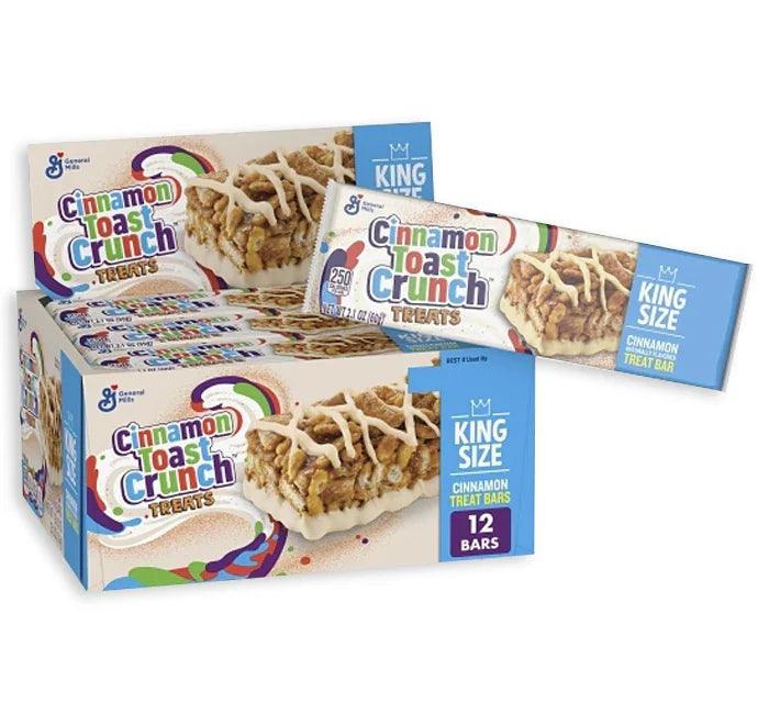 Box contains 12 Cinnamon Toast Crunch Cereal Bars - King Size, each with a net weight of 2.1 ounces.