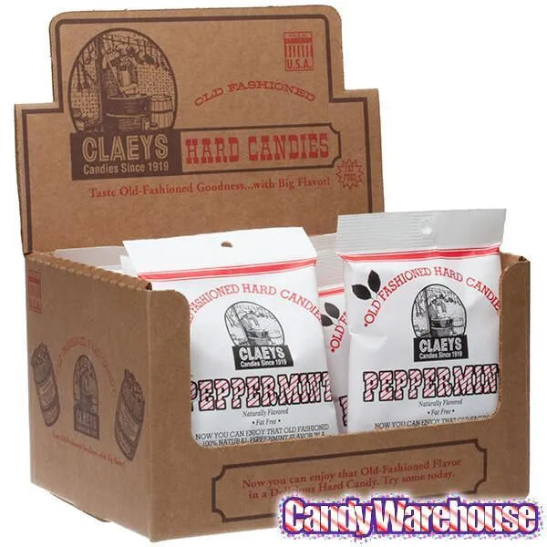 Display box contains 12 Claeys Natural Peppermint Hard Candy Drops Bags, each with a net weight of 6 ounces.
