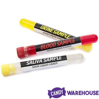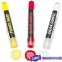 The Crime Scene Candy pack includes 3 laboratory-style vials filled with liquid bodily fluids.