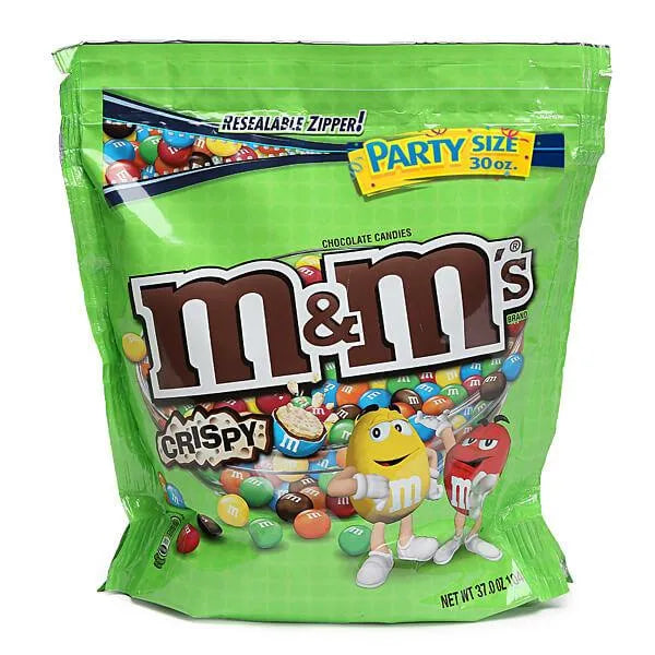 Resealable bag contains 30 ounces of Crispy Milk Chocolate M&M's Candy.