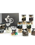 Great to give as a gift! Our deluxe gourmet gift box contains 156 servings of popcorn, pretzels, potato chips, gourmet candies and more. Pretzels and popcorn are covered with three kinds of chocolate or peanut butter and mixed with caramel.