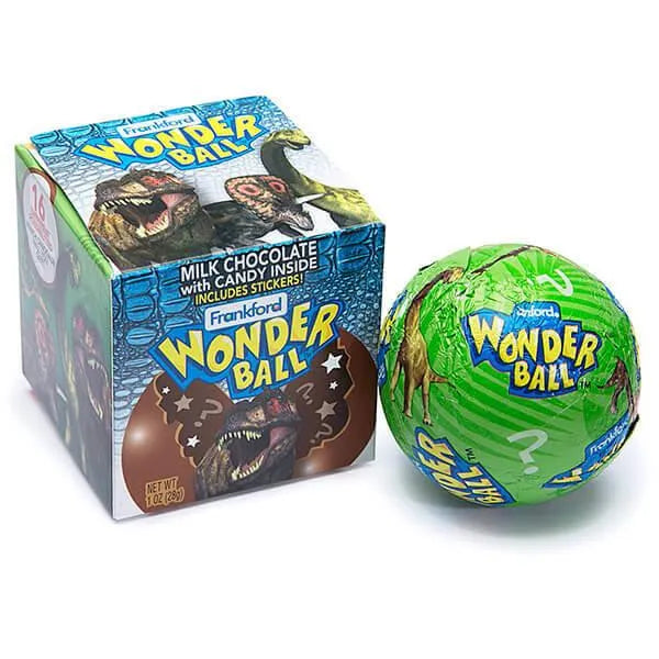 Experience the wonder of the WonderBall! Delicately wrapped in colorful metallic foil is a perfect sphere of hollow milk chocolate concealing an amazing surprise inside... candy dinosaurs! Crack into a ball to unleash a stampede of sweet prehistoric beasts upon your taste buds.