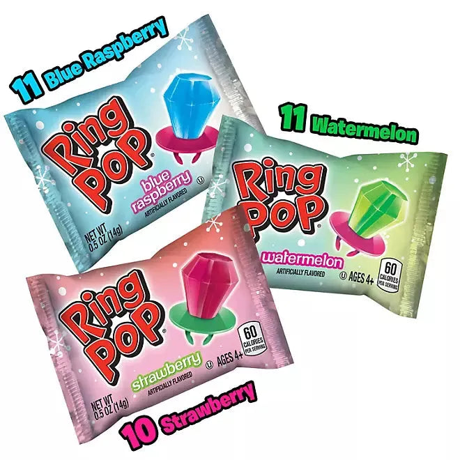 The Ring Pop Egg Hunt Candy Variety Pack (50 Count) is the ultimate Easter treat, available at Candy Warehouse! This festive Easter Ring Pop box features 50 individually wrapped Ring Pops in three delicious flavors: strawberry, blue raspberry, and watermelon. Perfect for Easter egg hunts, party favors, baskets, and sharing, these colorful, oversized candy rings have been a kid-favorite for over 40 years. Whether you're looking to add some fun to your Easter celebrations or stock up on a nostalgic treat, grab your Ring Pop Egg Hunt Variety Pack today from Candy Warehouse and let the sweet, wearable fun begin!