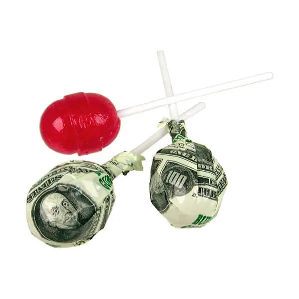 Everyone's favorite bill.... wrapped around a jumbo-size strawberry lollipop with a bubble gum center! Ben Franklin apparently loved sweets.... his grin seems extra big on these $100 bill wrappers.Total Length: 4.5 Inches