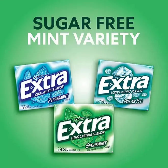 Get ready to freshen up with one (1) 18-count bulk box of EXTRA Sugar-Free Chewing Gum Variety Packs! This box is packed with three cool and refreshing flavors: EXTRA Polar Ice, EXTRA Spearmint, and EXTRA Peppermint. Perfect for keeping your breath fresh and your taste buds happy!