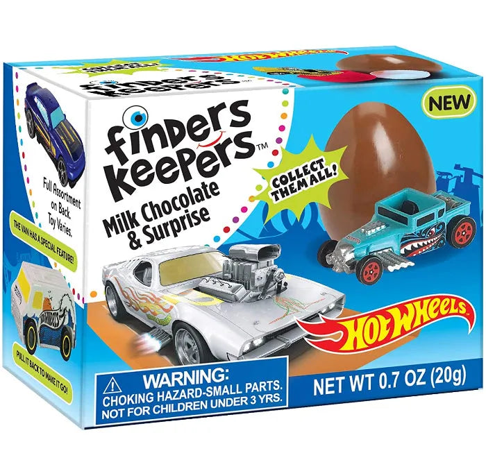 Rev up the excitement with the Hot Wheels Finders Keepers Egg! Each box contains a creamy milk chocolate candy egg and a surprise Hot Wheels toy inside. With nine different cars to collect, every box is a thrilling race to complete the set!