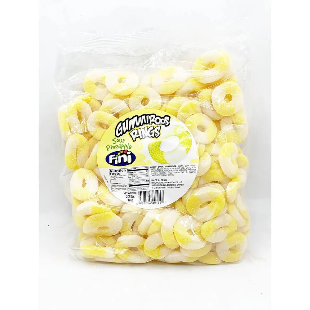 Tropic like it's hot with Fini sour pineapple gummy rings! This 1KG bag is filled to the brim with mouth-puckeringly-sour pineapple rings that are sure to send your taste buds on a wild rollercoaster ride. Get your party started with Fini from Candy Warehouse!