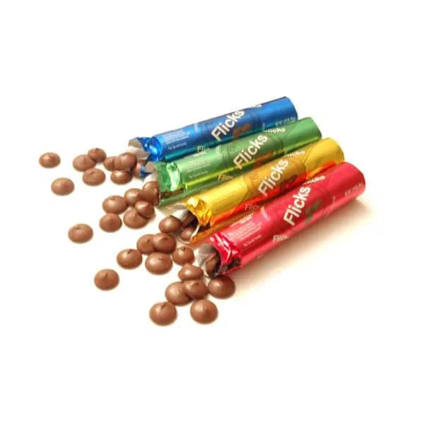 Display box contains 12 Flicks Chocolate Candy Tubes.