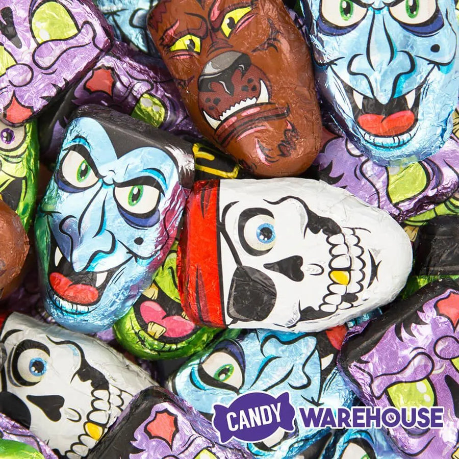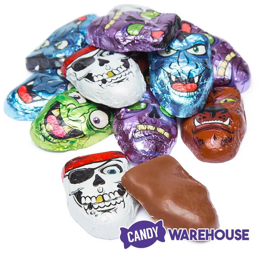 Bag contains 12 pounds of Foiled Chocolate Monster Heads Candy.