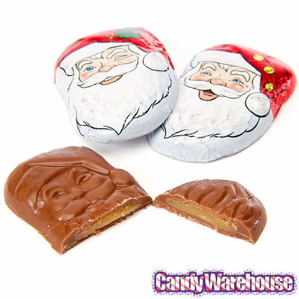 Bag contains 4 pounds of Foiled Milk Chocolate Santas with Caramel Filling.
