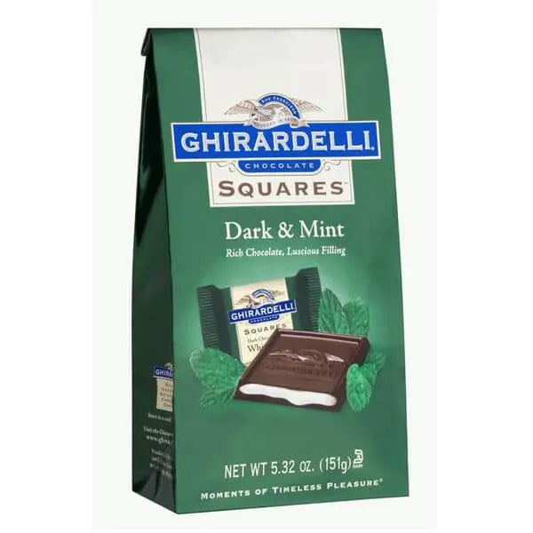 Box contains 6 Ghirardelli Dark Chocolate Squares with Mint Filling Candy Bags, each with a net weight of 5 ounces.