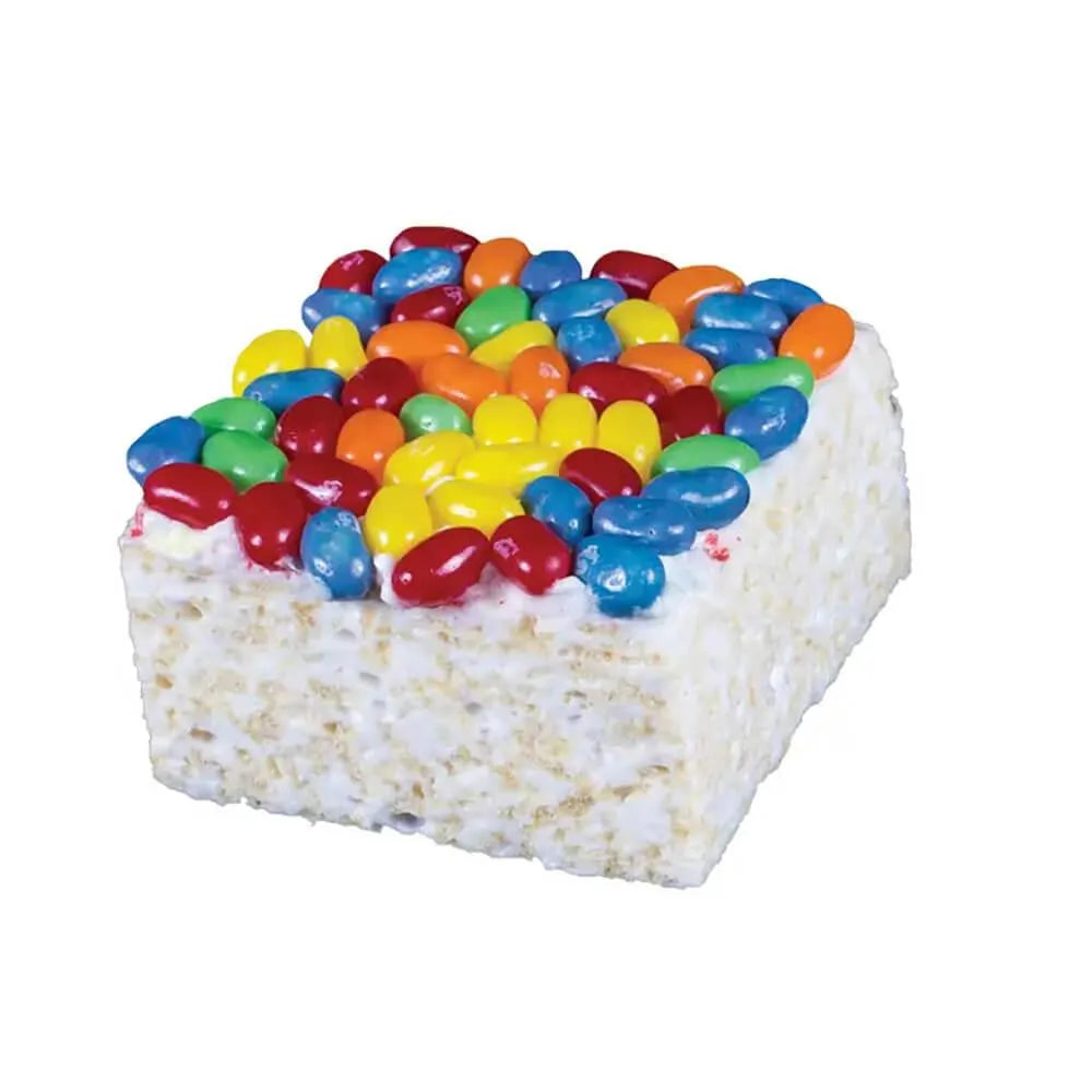 Gourmet marshmallow rice CRISPYCAKE topped with colorful mini jelly beans. The perfect blend of Marshmallows and rice crispies with soft jelly bean candies on top.