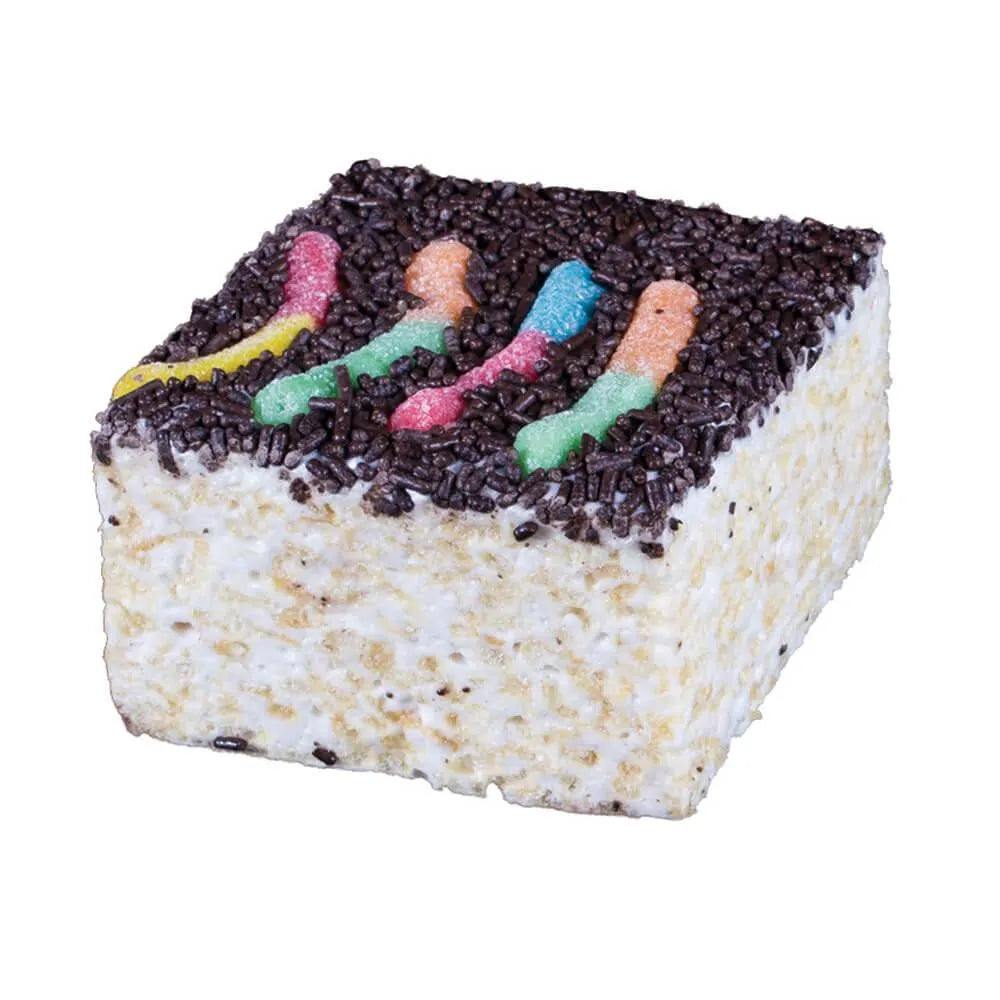 You don't have to be a kid to enjoy this colorful tasty gourmet marshmallow rice CRISPYCAKE. This unique Crispycake comes with colorful sour patch "worms" placed on a bed or chocolate sprinkles. Now you see why it is called "Worms in Dirt" this is the richest dirt and the best tasting worms you could ever want!