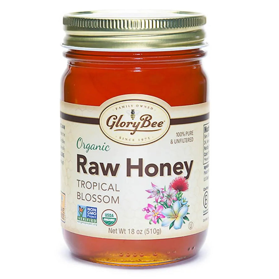 Glass jar contains 18 ounces of GloryBee Organic Tropical Blossom Raw Honey.