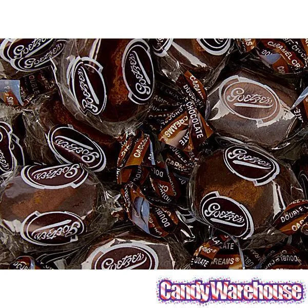 Bag contains 5 pounds of Goetze's Double Chocolate Brown Caramel Creams Candy.