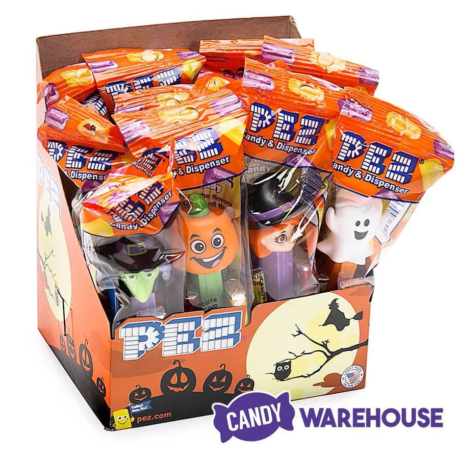 Display box contains 12 Halloween PEZ Candy Packs, each with 1 dispenser and 2 candy corn flavor refill cartridges.