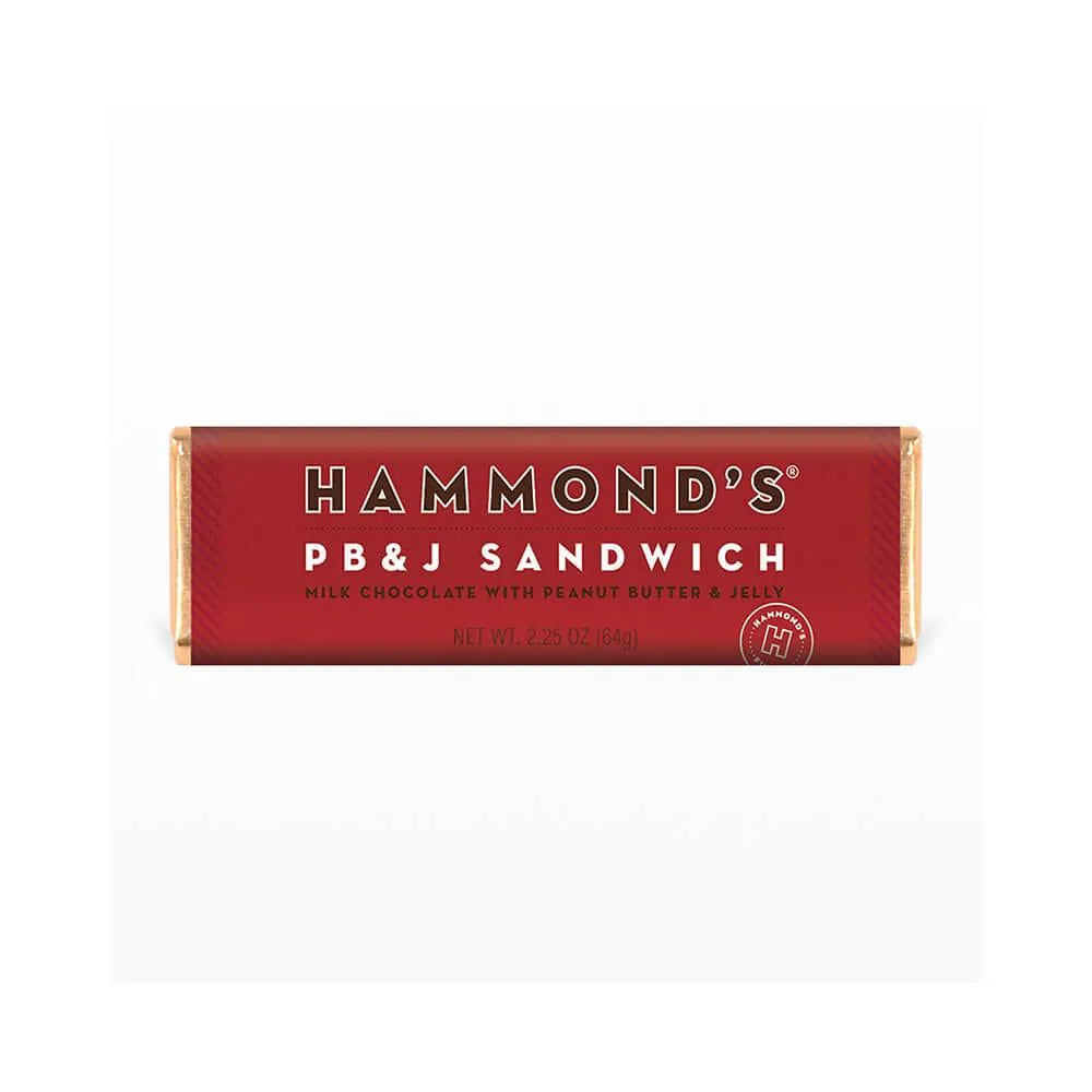 Prepare your palate for an explosion of sweet, yummy goodness found in Hammond’s PB&J Sandwich milk chocolate bars. If you think a PB&J on wheat is to die for — wait until you try this PB and J candy bar. The classic flavor pairing of peanut butter and jelly tastes 10-times better when sandwiched between rich milk chocolate! Hammond’s gourmet candy bar handmade from premium, locally sourced ingredients is creamy, nutty, fruity, and smooth. What more could a milk chocolate-lover want? This peanut butter chocolate bar stuffed with a sweet jelly filling proves that we never outgrow our love for the timeless PB&J. It’s just one of the fine Hammond’s candy products in stock at Candy Warehouse. Fortunately, this unique twist on an iconic favorite comes in a 12-piece box. We’re confident that once you sample Hammond’s handcrafted small-batch candy, you’re going to be back for more.