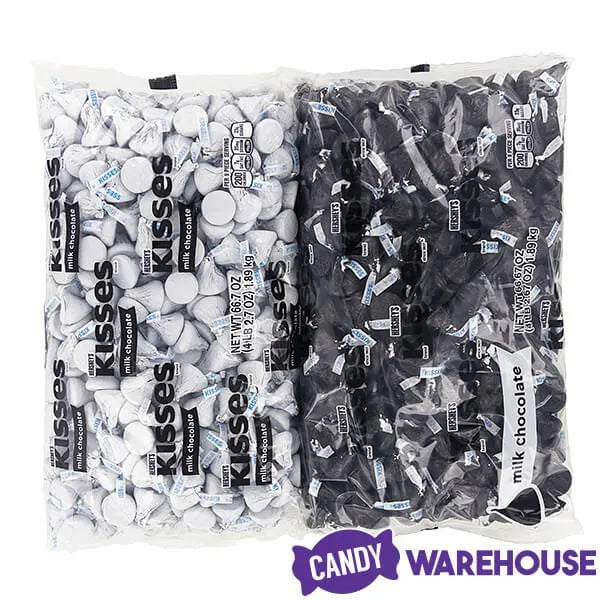 Box contains 800 pieces of Hershey's Kisses Black Foiled and White Foiled Milk Chocolate Candy packed in two bags, each with a net weight of 66.7 ounces.