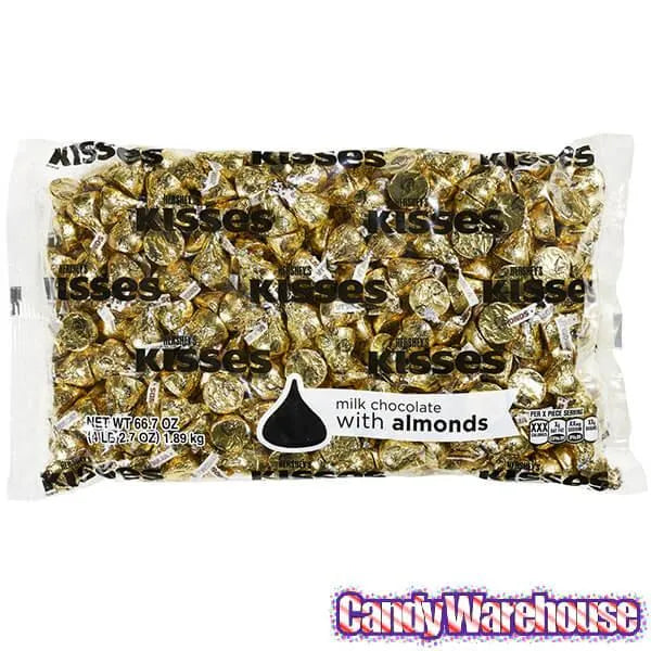 Bag contains 4 pounds of Hershey's Kisses Gold Foiled Milk Chocolate with Almonds Candy.