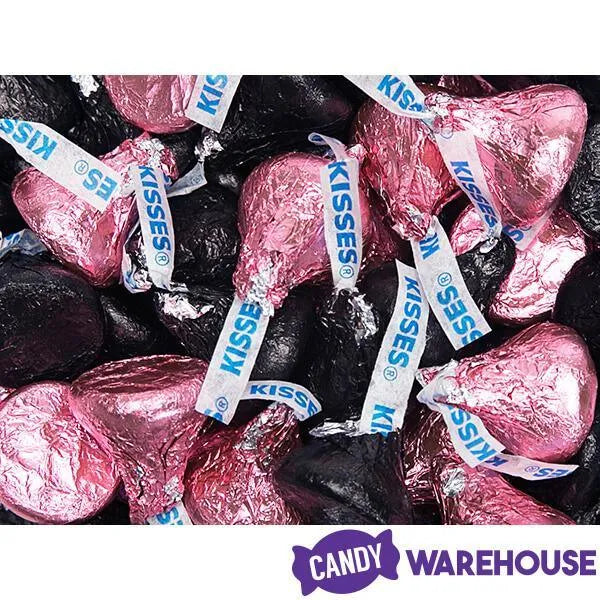 Box contains 800 pieces of Hershey's Kisses Pink Foiled and Black Foiled Milk Chocolate Candy packed in two bags, each with a net weight of 66.7 ounces.