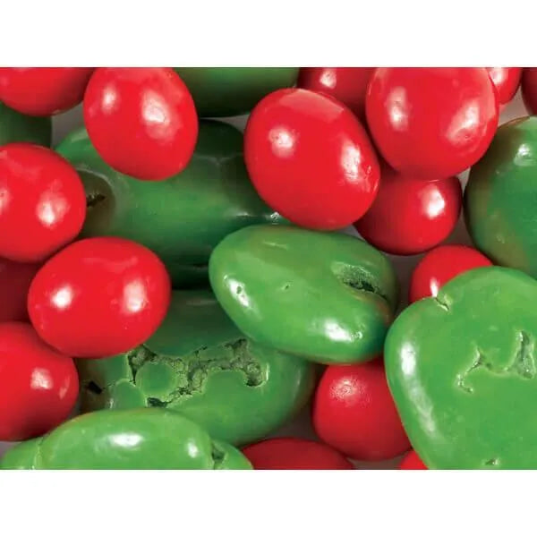 Dried, flattened cherries are coated in green chocolate and dried cranberries are coated in red chocolate to create this fun holiday candy mix. Perfect for Christmas candy dishes!
