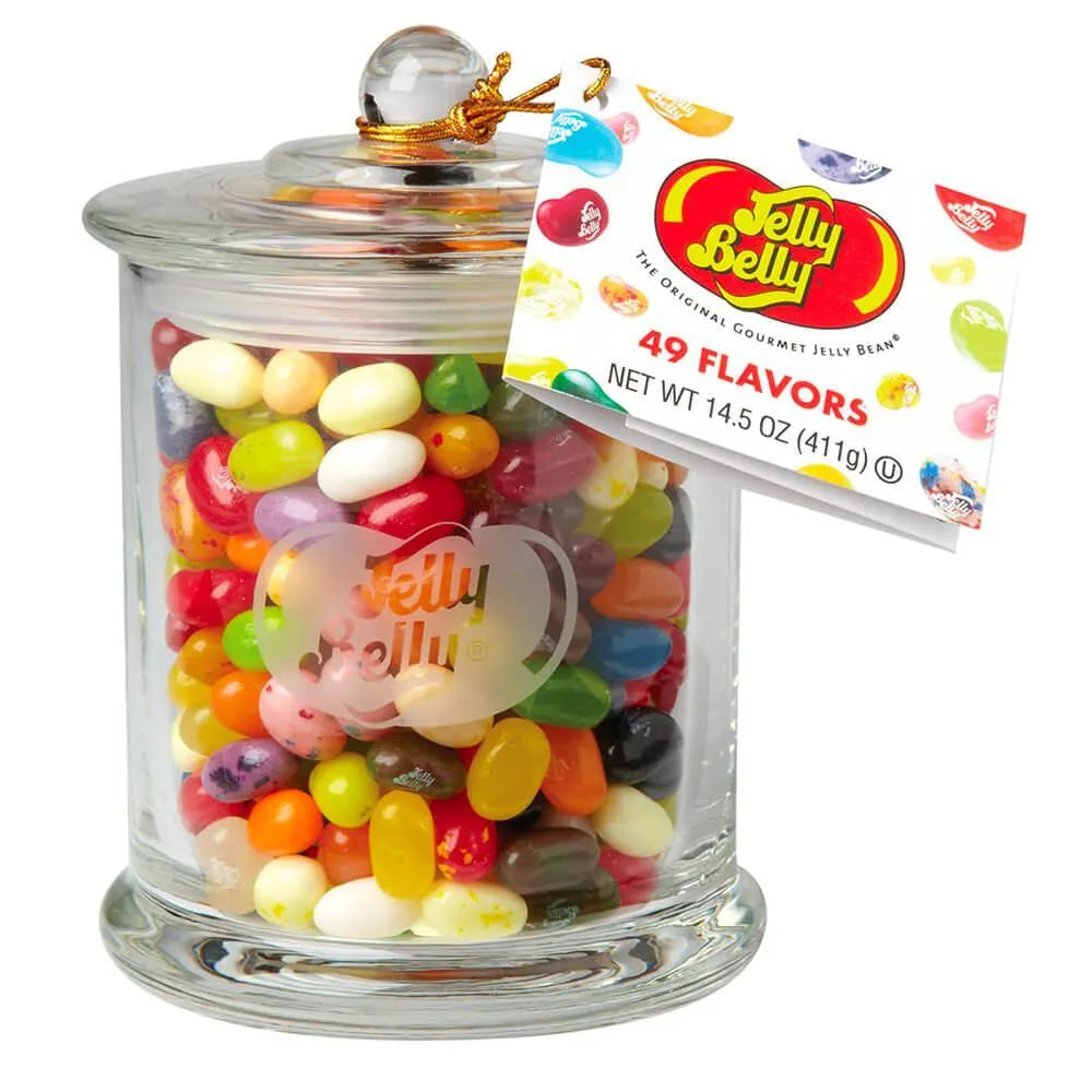 Here's 49 flavors of classic Jelly Belly jelly beans packed into a stylish candy jar. Make any room feng shui by adding this contemporary glass jar to the nearest coffee table, work desk or counter. Pop off the lid and enjoy regularly!