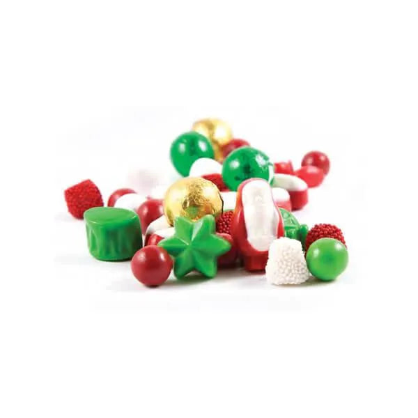 Assorted Christmas candy in a variety of colors and flavors, including foil-wrapped chocolate bells, candy-shelled almonds, chocolate covered malt balls, rich mellocremes, and much more!